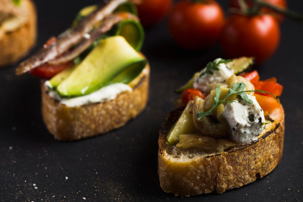 Fatias de pão italiano torrado, cobertas com uma mistura fresca de tomates picados, manjericão, alho, azeite de oliva extra virgem e um toque de balsâmico.