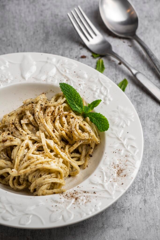 Massa italiana al dente envolvida em um molho cremoso à base de gemas de ovos, queijo e pecorino, com pedacinhos de pancetta crocante, finalizada com pimenta-do-reino moída na hora.